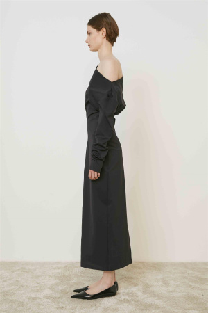 Elegant kjole fra Meimeij med drapert båthals. Kjolen har maxilengde med splitt bak og lange ermer. Åpnes i siden med