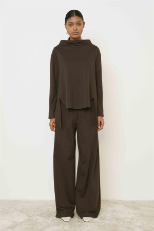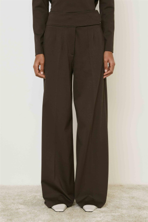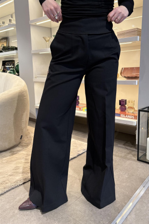 Dressbukse fra italienske Meimeij. Buksen er høy i livet med vide utsvingte bein. Den har stikklommer i siden og folder.