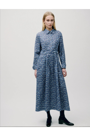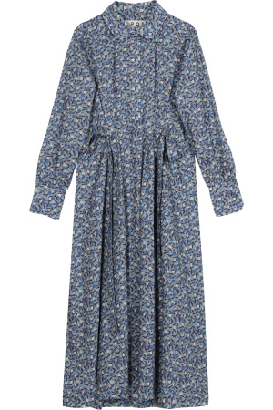 Iben Dress fra APOF er en skjorteinspirert kjole med krage, knappelukking øverst og et voluminøst plissert skjørt. Det botaniske printet